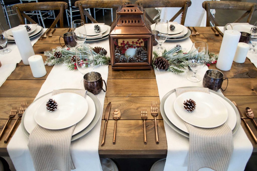 Products pictured: Walnut Stained Farm Style Table, Presley Flatware, Linen White Runner, Lucca Grey Chop Plate, Lucca Ivory Dinner Plate, Lucca Ivory Salad Plate, Copper Mug, Sonoma Water Goblet, Clooney Stripe Wheat Napkin.