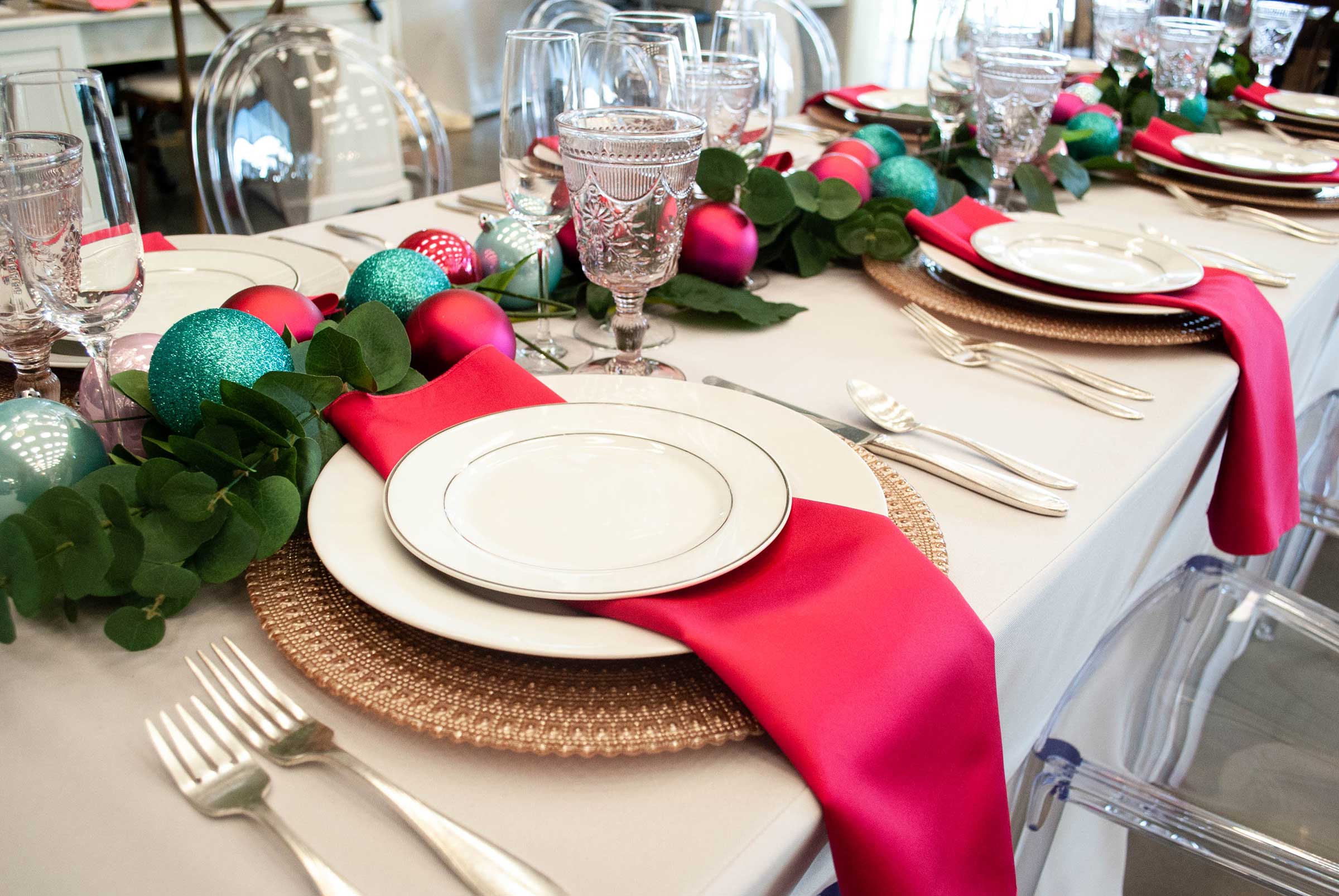 Products pictured: Satin Fuchsia Napkin, Ava Blush Charger, Lucca Ivory Dinner Plate, Jane Silver Salad Plate, Scroll Flatware, Pink Dixie Goblet, Sonoma Champagne Glass, Phantom Dining Chair.