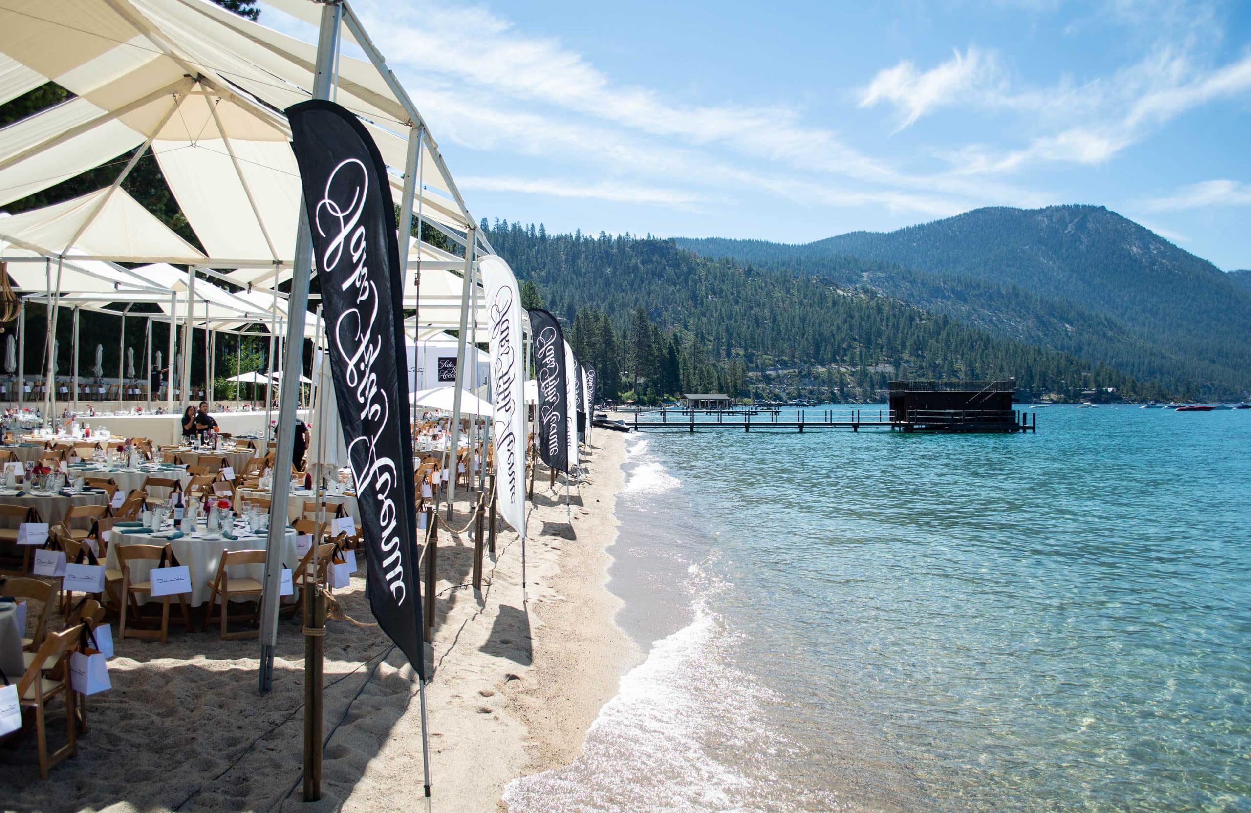 Each year for the past 50 years, Oscar de la Renta and Saks Fifth Avenue host a fashion show on the shores of Lake Tahoe to raise money for the League to Save Lake Tahoe. This year’s profits broke records at $1.1 million raised for the league, which is working hard to Keep Tahoe Blue by “combatting pollution, promoting restoration, tackling invasive species and protecting Tahoe’s shoreline.” Celebrations had the honor of constructing the scene for this event, including an elevated runway and a Saks Fifth Avenue shopping tent, all on a sandy beach in Incline Village.