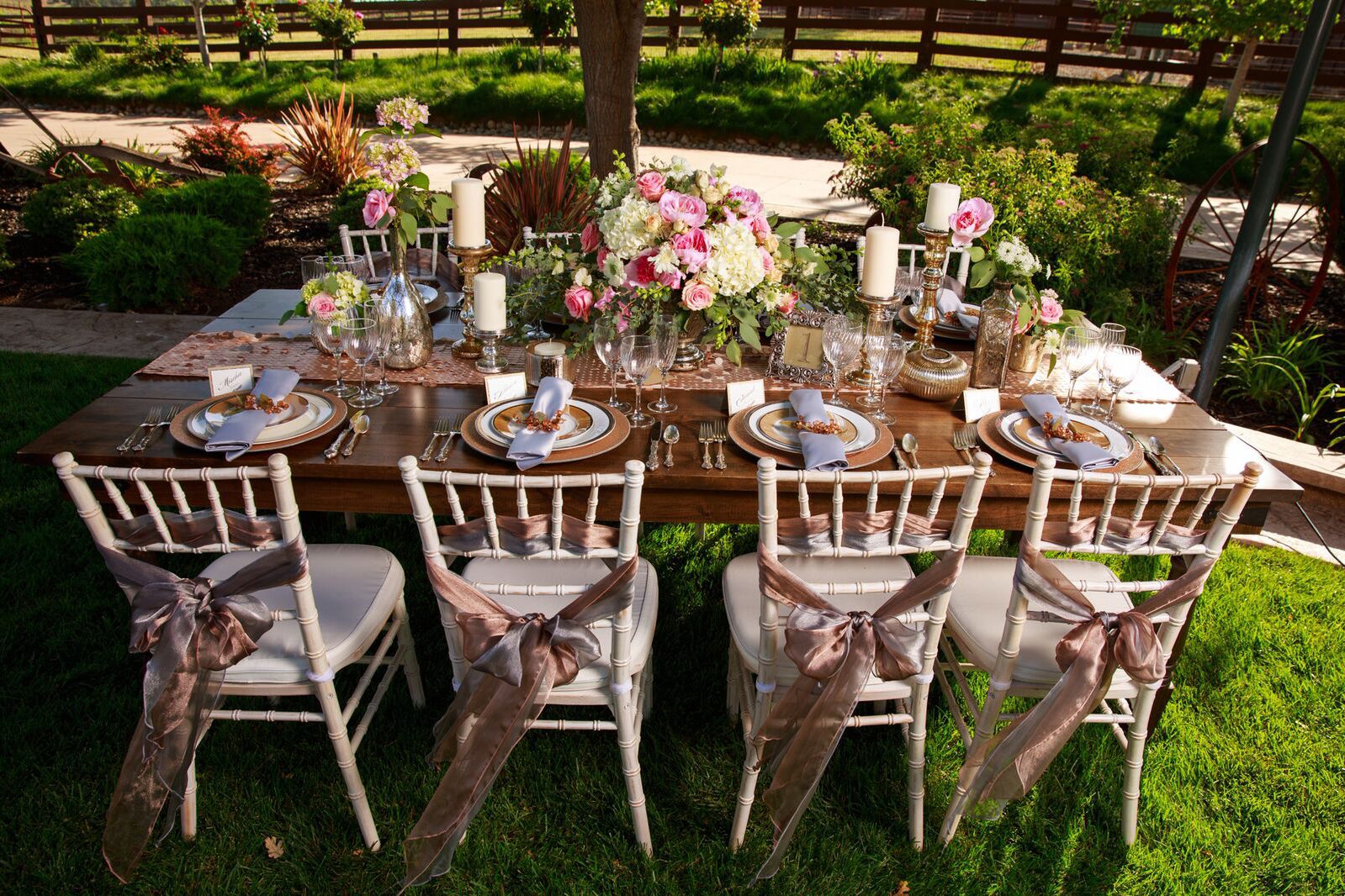 Products pictured: Vintage Wash Chiavari Chair, Walnut Stained Farm Style Table, Charm Runner, Platinum Dishware, Cognac Luster Dishware, Glitz Gold Charger, Royce Silver Flatware, Organza Bronze Chair Sash, Organza Pewter Chair Sash, Satin Silver Napkin, Gold Chiavari Chair, Distressed Wood Chandelier, Mahogany Chiavari Chair, Emma Glassware, Gunmetal Dining Chairs, Walnut Stained Farm Style Round Table, Linen Sea Green Runner, Maze Clay Runner, Kalvin Dishware, Linen Sea Green Napkin, Smith Flatware, Sonoma Glassware, Stemless Wine Glass, Phantom Dining Chair, Phantom Accent Chair, Light-Up Cubes, Mint Julep Cup, Crossback Chair, Felicity Dining Chair, Samsonite Folding Chair.