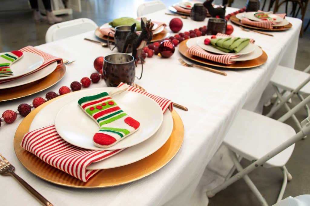 Create a festive scene on your table with a curated vignette of all things holiday. Mini trees, Santa figurines, and themed candle holders can come together for an eclectic centerpiece, especially if you are hosting on a round table. Use a tiered tray or a cake stand to elevate your décor and make it really stand out.