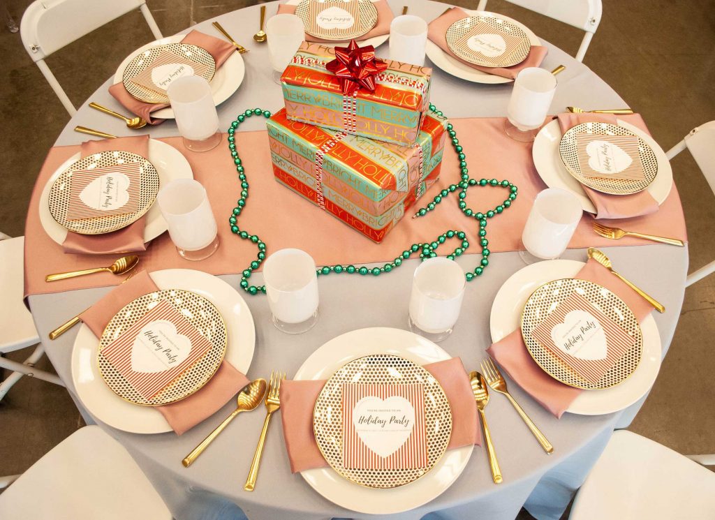 Products pictured: Linen White Table Linen, Lacquered Gold Charger, Lucca Ivory Dinner Plate, Lucca Ivory Salad Plate, Zipp Tomato Napkin, Presley Flatware, Copper Mug, White Child’s Chair.
