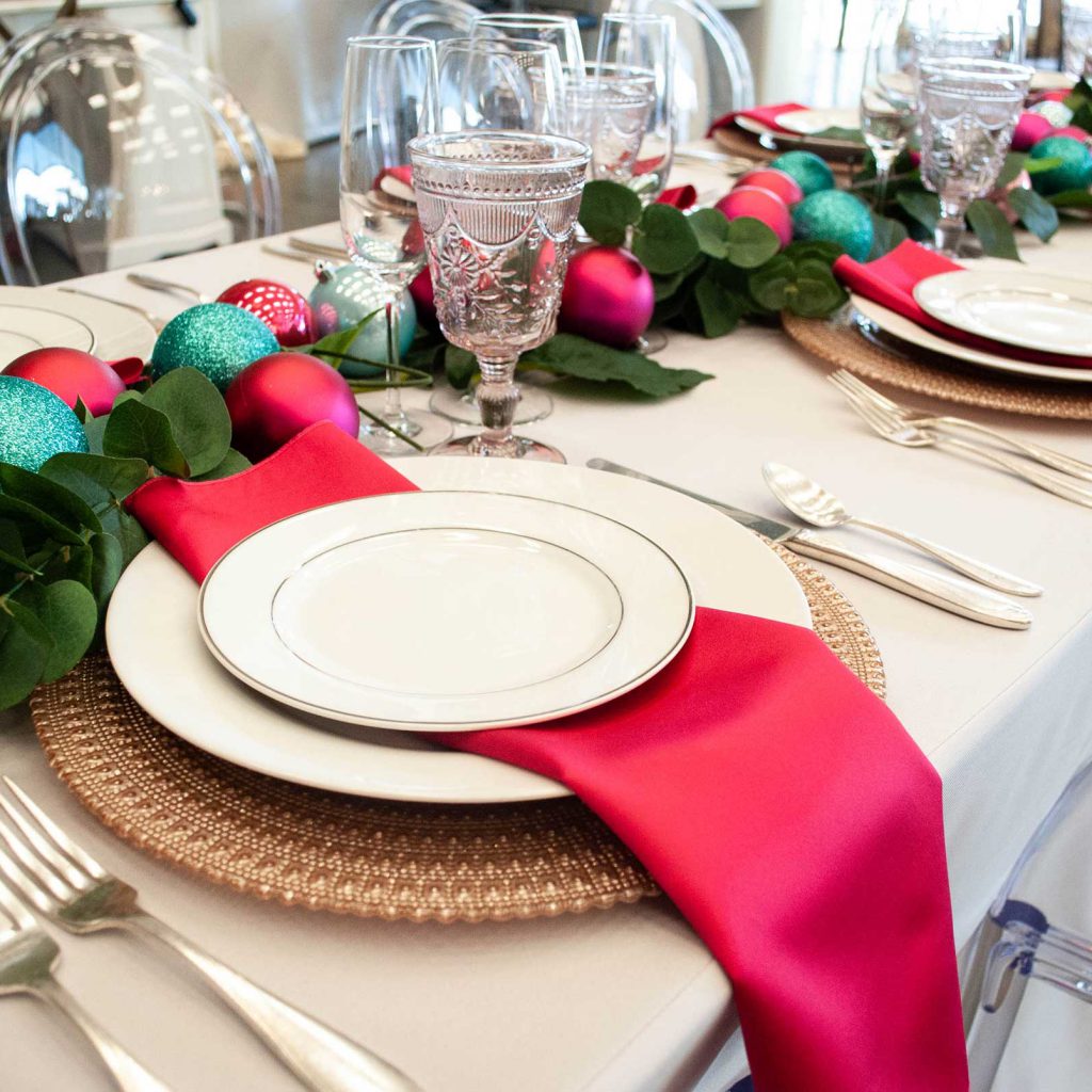 Products pictured: Satin Fuchsia Napkin, Ava Blush Charger, Lucca Ivory Dinner Plate, Jane Silver Salad Plate, Scroll Flatware, Pink Dixie Goblet, Sonoma Champagne Glass, Phantom Dining Chair.