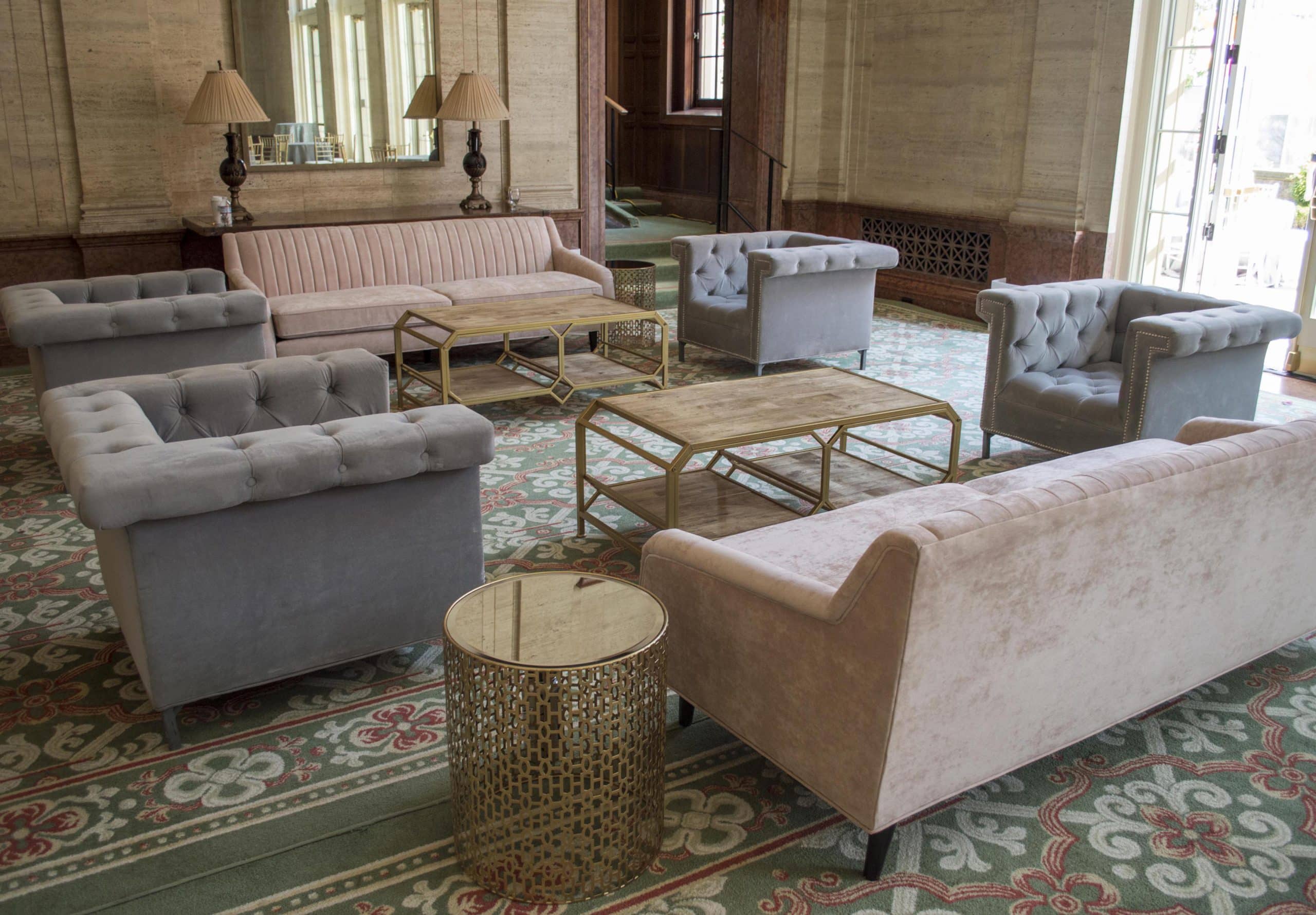 Products pictured: Betty Blush Sofa, Leyton Chair, Harper Coffee Table, Enzo Side Table – Gold Large, Draper Sofa, Monroe Ottoman – Mauve, Faux Marble Tray, Brigette Pillow – Rose, Draper End Table, Panama Loveseat, Stemless Wine, Kate Cup, Kate Saucer, Silver Teapot, Mr. Pillow, Mrs. Pillow, Felicity Settee, Monroe Ottoman – Indigo.