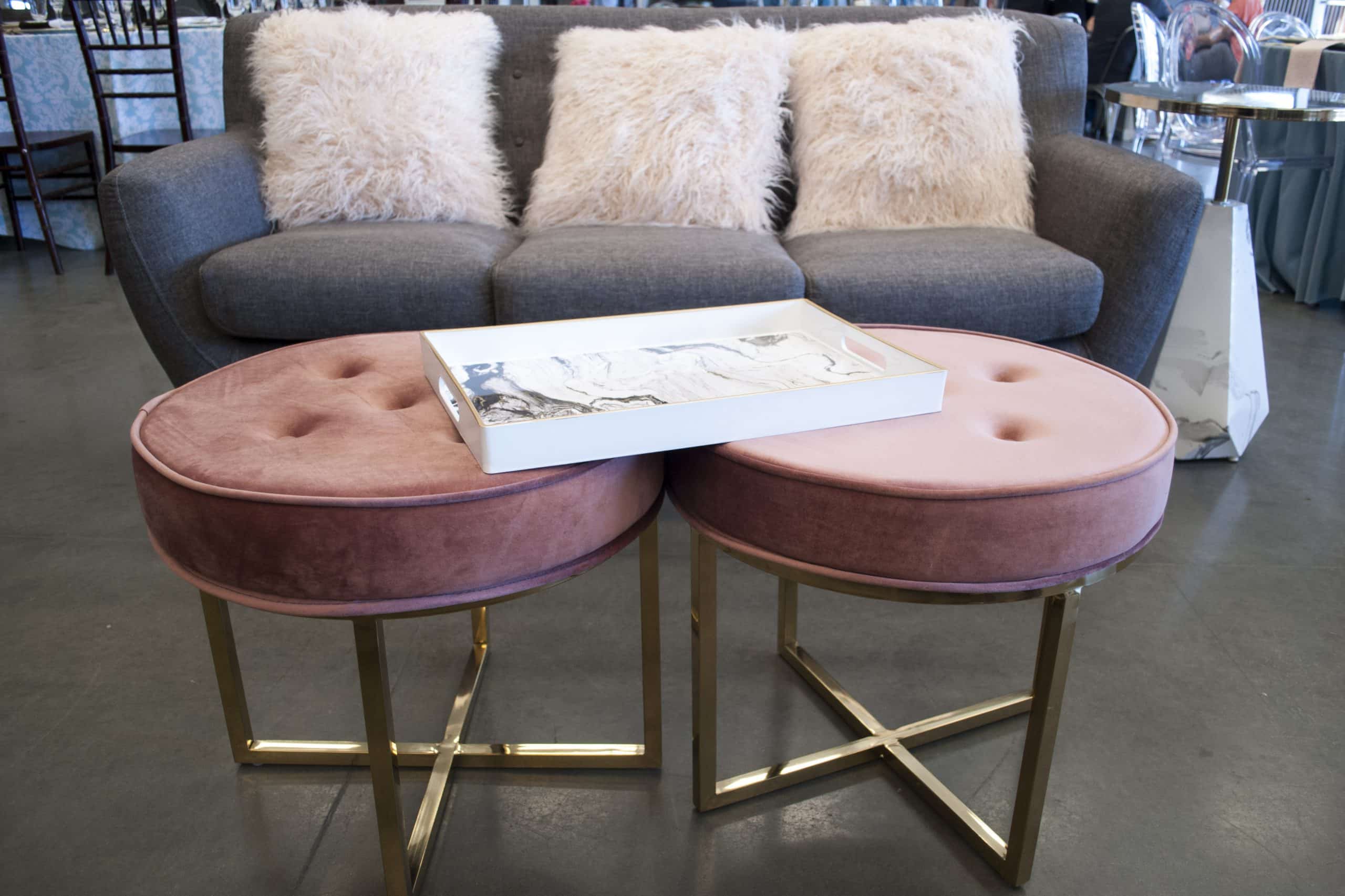 Products pictured: Draper Sofa, Brigette Pillow – Blush, Monroe Ottoman – Mauve, Faux Marble Tray, Element Side Table, Linen Stone Tabledrape, Lindsey White Runner, Glass Plain Gold Rim Charger, Nova Flatware, Ledge Balloon Wine, Sonoma Iced Beverage, Sonoma Champagne, Bistro Dinner Plate, Lauren Plate, Linen Rose Napkin, Linen Sea Green Napkin, Felicity Settee, Mr. Pillow, Mrs. Pillow, Light Pink Polyester Tabledrape, Ava Blush Charger, Lucca Ivory Dinner Plate, Lucca Ivory Salad Plate, Royce Silver Flatware, Emma Wine, Emma Water, Emma Champagne, Linen Pink Napkin, Satin Mauve Napkin, Sprinkle Blush Runners, Norden Bar, Caprice Tangerine Runner, Organza Fuchsia Overlay, Pink Dixie Goblet, Glass Beverage Dispenser – 4 Gallon, Caprice Marine Tabledrape, Burst Gold Charger, Walnut Stained Farm Style Round Table, Dolce Slate Blue Runner, Elsa Glass Charger, Metro Flatware, Maui Clear Dinner Plate, Charleston Salad Plate.