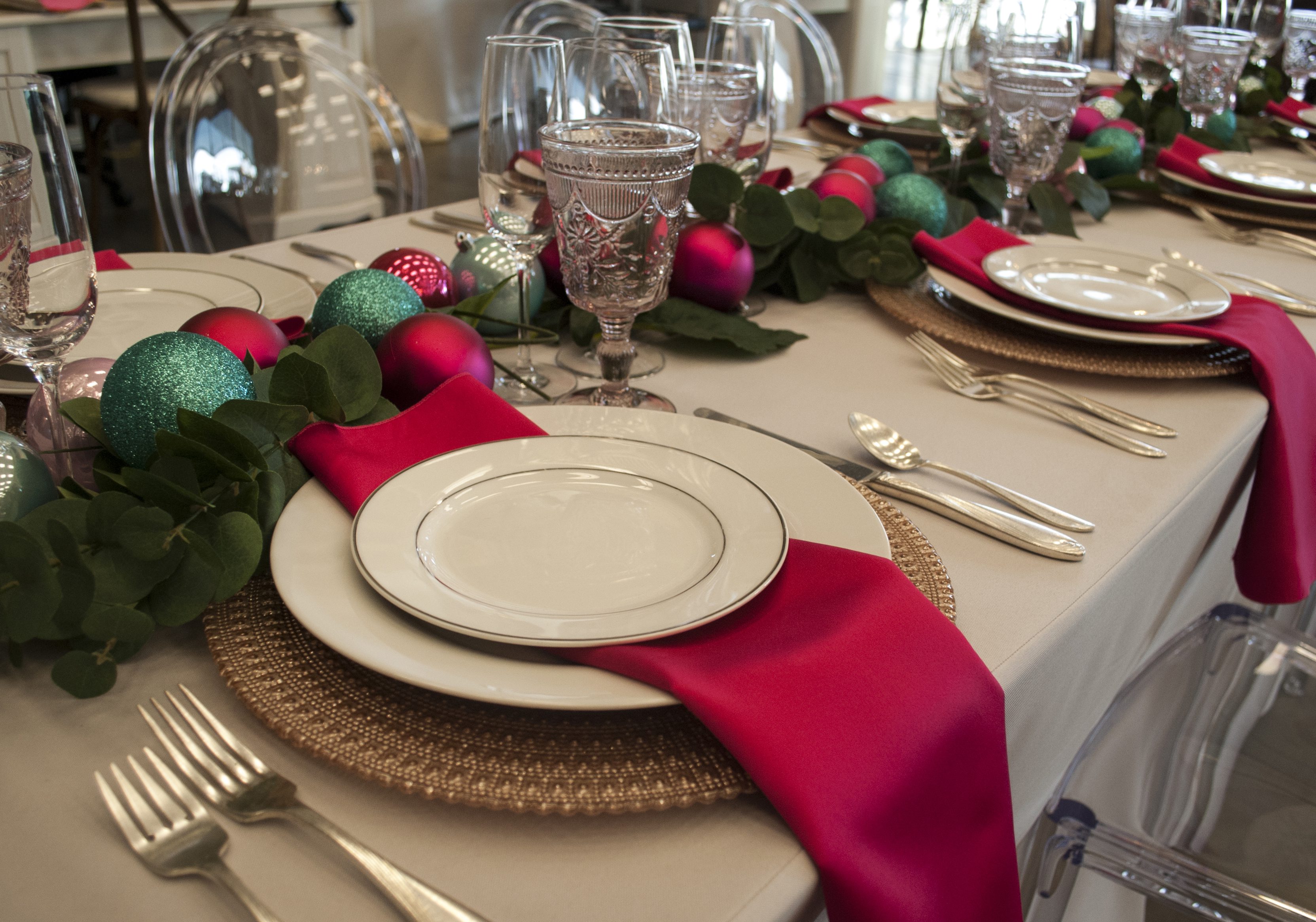 Products pictured: Felicity Settee, Mr. Pillow, Mrs. Pillow, Walnut Stained Farm Style Round Table, Bristol Plaid Runner, Scarlet Linen Napkin, Glass Plain Gold Rim Charger, Victoria Dishware, Dottie Salad Plate, Parker Flatware, Empire Glassware, Gold Candlesticks, Light Grey Polyester Tabledrape, Ava Blush Charger, Bistro Dishware, Jane Silver Dishware, Scroll Flatware, Satin Fuchsia Napkin, Pink Dixie Goblets, Sonoma Glassware, Caprice Ruby Tabledrape, Black and White Stripe Runner, Beaded Gold Charger, Ritz Dishware, Kalvin Dishware, Moss Polyester Napkin, Cabo Palm Napkin, Black Benson Water Goblets, Belle Glassware, Cosmo Coffee Mug, White Polyester Tabledrape, Satin Gold Napkin, Burst Gold Charger, Kate Dishware, Royce Gold Flatware, Walnut Stained Farm Style Table, Platinum Dishware, Gabrielle White Napkin, Beaded Platinum Charger, Metro Flatware, Pewter Polyester Runner, 28” Brushed Platinum 5 Light Candelabra, Vintage Folding Table, Marilyn Dishware, Green Polyester Runner, Kensington Pewter Napkin, Cornflower Polyester Tabledrape, Satin Mauve Runner, Satin Mauve Napkin, White Benson Water Goblets, Sprinkle Gold Tabledrape, Charleston Dishware, Mercury Votives, Cranberry Polyester Napkin, Dusty Rose Polyester Napkin, Navy Polyester Tabledrape, Burst Silver Charger, Clear Votives, Royce Silver Flatware, Chelsea Ivory Napkin.