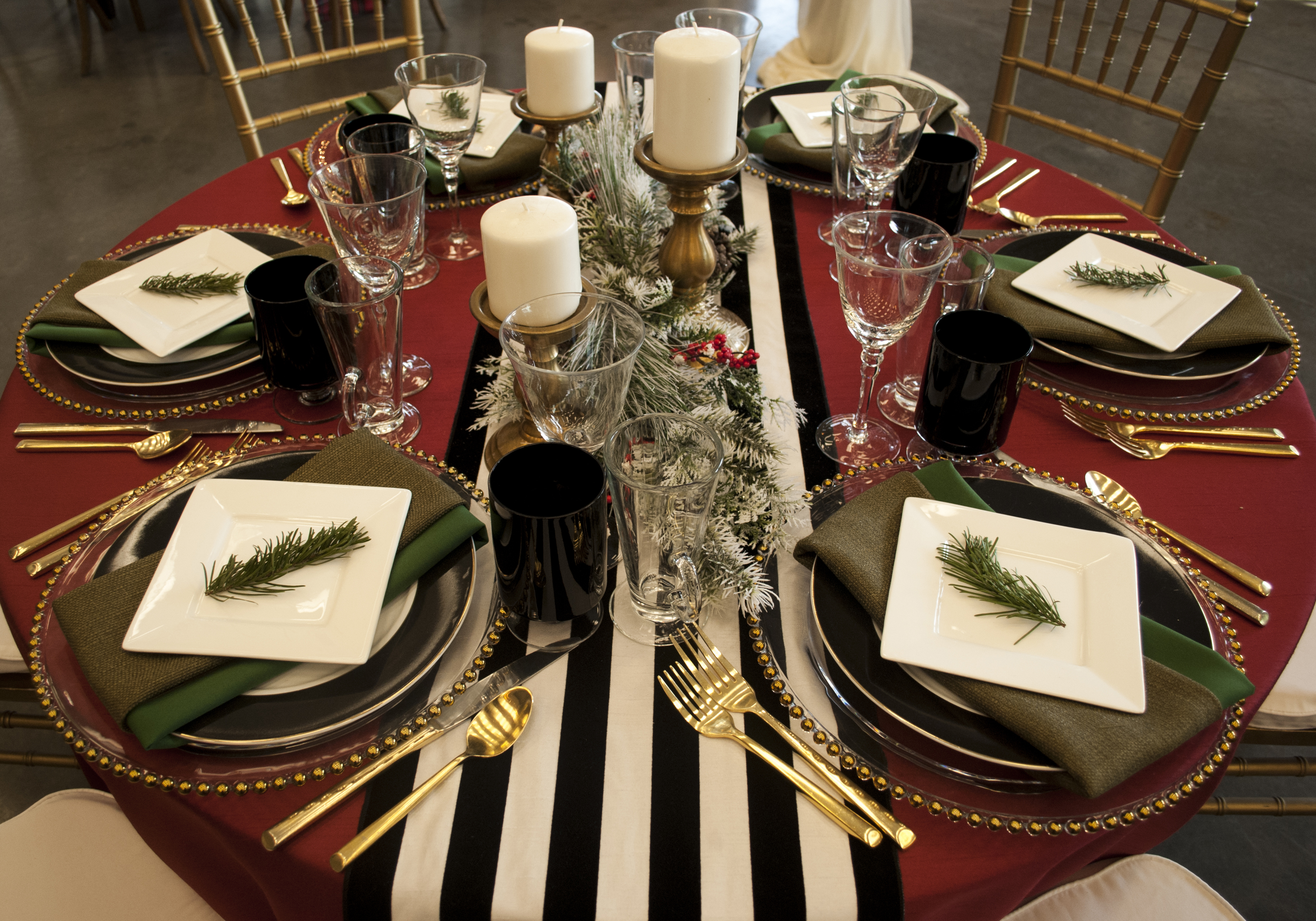 You can’t go wrong with a timeless look like this! Red plaid paired with gold on a natural wood table will instantly set the mood for a classic Christmas celebration.